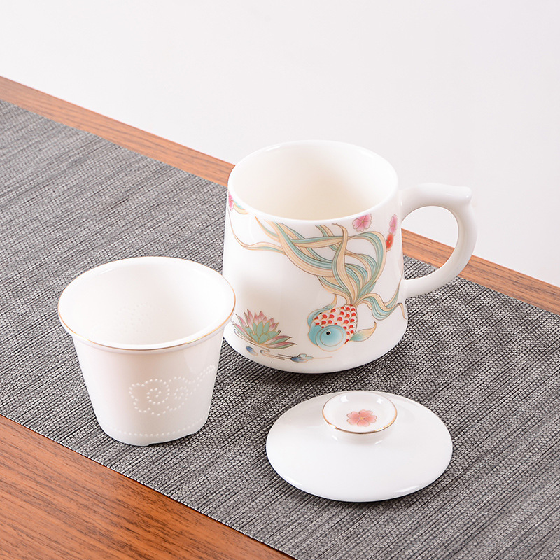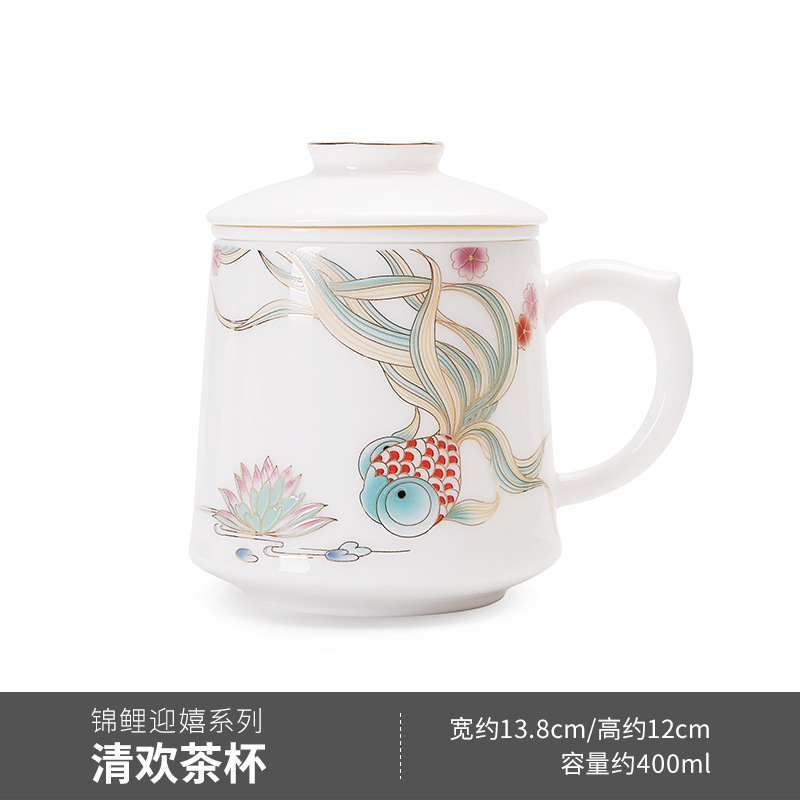 白瓷中式錦鯉馬克杯茶水分離泡茶杯帶蓋辦公室過濾喝茶杯家用水杯